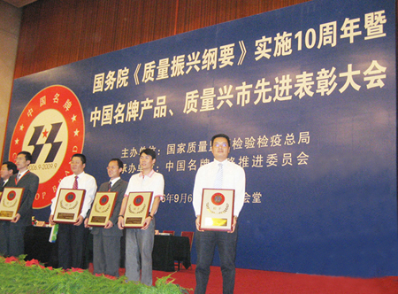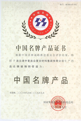 2006年9月6日,由國家質量監(jiān)督檢驗檢疫總局主辦,中國名牌推進委員會承辦的國務院《質量振興綱要》實施十周年暨中國名牌產品、質量興市先進表彰大會在北京人民大會堂順利召開。中復連眾生產的“連眾”牌玻璃鋼管道喜獲“中國名牌”稱號,喬光輝總經理上臺領取了獎牌和證書。這是暨2005年獲得江蘇省著名商標以來“連眾”牌玻璃鋼管道獲得的又一殊榮。