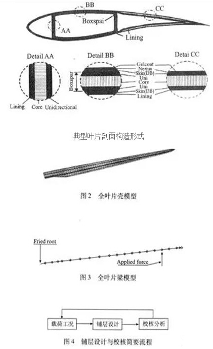 結(jié)構(gòu)鋪層校核對(duì)葉片結(jié)構(gòu)設(shè)計(jì)來說也必不可少。前在校核方面,大多用通用商業(yè)有限元軟件,比如ANSYS、NASTRAN、ABAQUS等。對(duì)葉片進(jìn)行校核時(shí),考慮單層的極限強(qiáng)度、自振頻率和葉尖撓度,分析模型有殼模型和梁模型等,并且能夠做到這兩種模型的相互轉(zhuǎn)換,如圖2,3所示。與其他葉片結(jié)構(gòu)相比,目前大型葉片的中空夾芯結(jié)構(gòu)具有很高的抗屈曲失穩(wěn)能力,較高的自振頻率,這樣設(shè)計(jì)出來的葉片相對(duì)較輕。有限元法可用于設(shè)計(jì),但更多用于模擬分析而不是設(shè)計(jì),設(shè)計(jì)與模擬必須交叉進(jìn)行,在每一步設(shè)計(jì)完成后,必須更新分析模型,重新得到鋪層中的應(yīng)力和應(yīng)變數(shù)據(jù),再返回設(shè)計(jì),更改鋪層方案,再分析應(yīng)力和變形等,直到滿足設(shè)計(jì)標(biāo)準(zhǔn)為止,如圖4所示。因?yàn)閺?fù)合材料正交各向異性的特殊性,葉片各鋪層內(nèi)的應(yīng)力并不連續(xù),而應(yīng)變則相對(duì)連續(xù),所以葉片結(jié)構(gòu)校核的失效準(zhǔn)則有時(shí)候完全采用應(yīng)變失效準(zhǔn)則。
